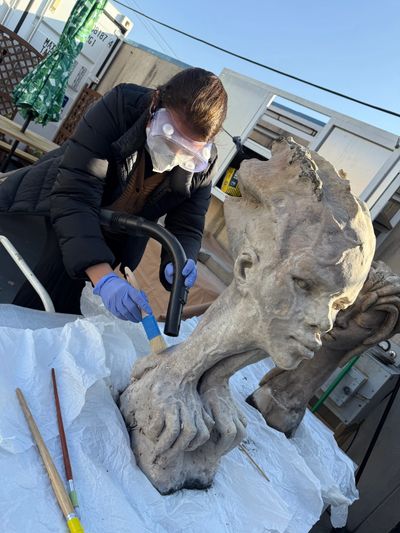 Photo on the right: Team member Agata Gravante conducting fire remediation cleaning on a ceramic bust by artist Michael Chukes.