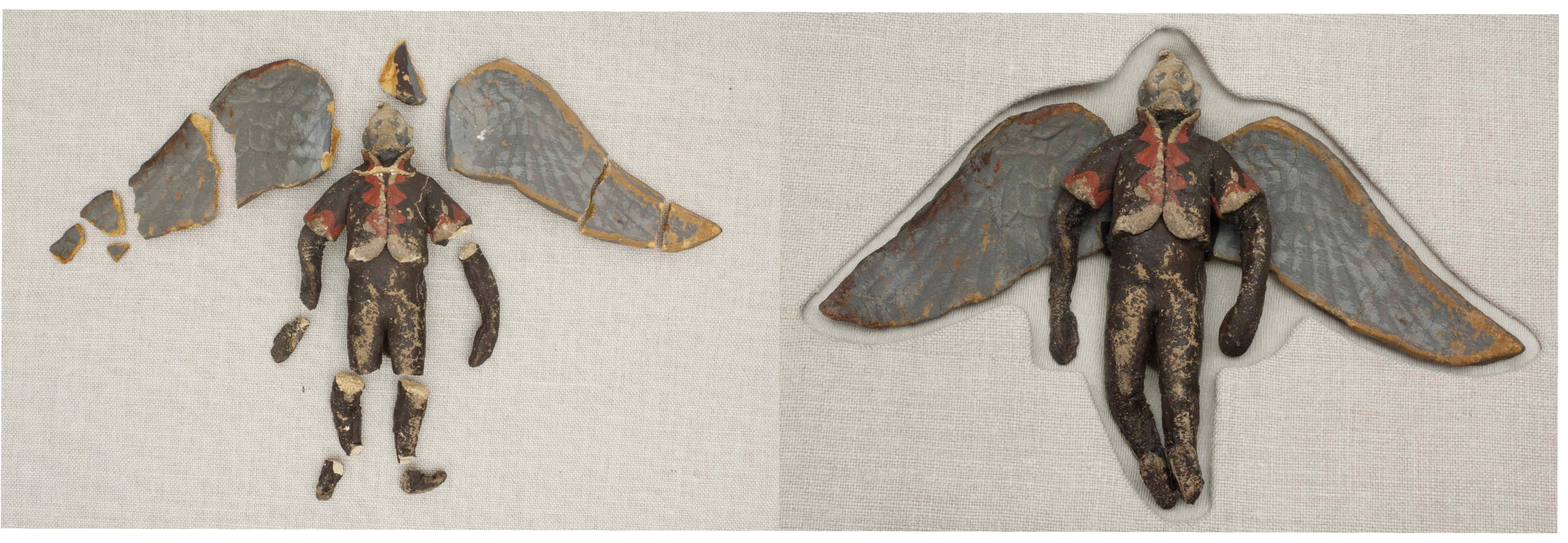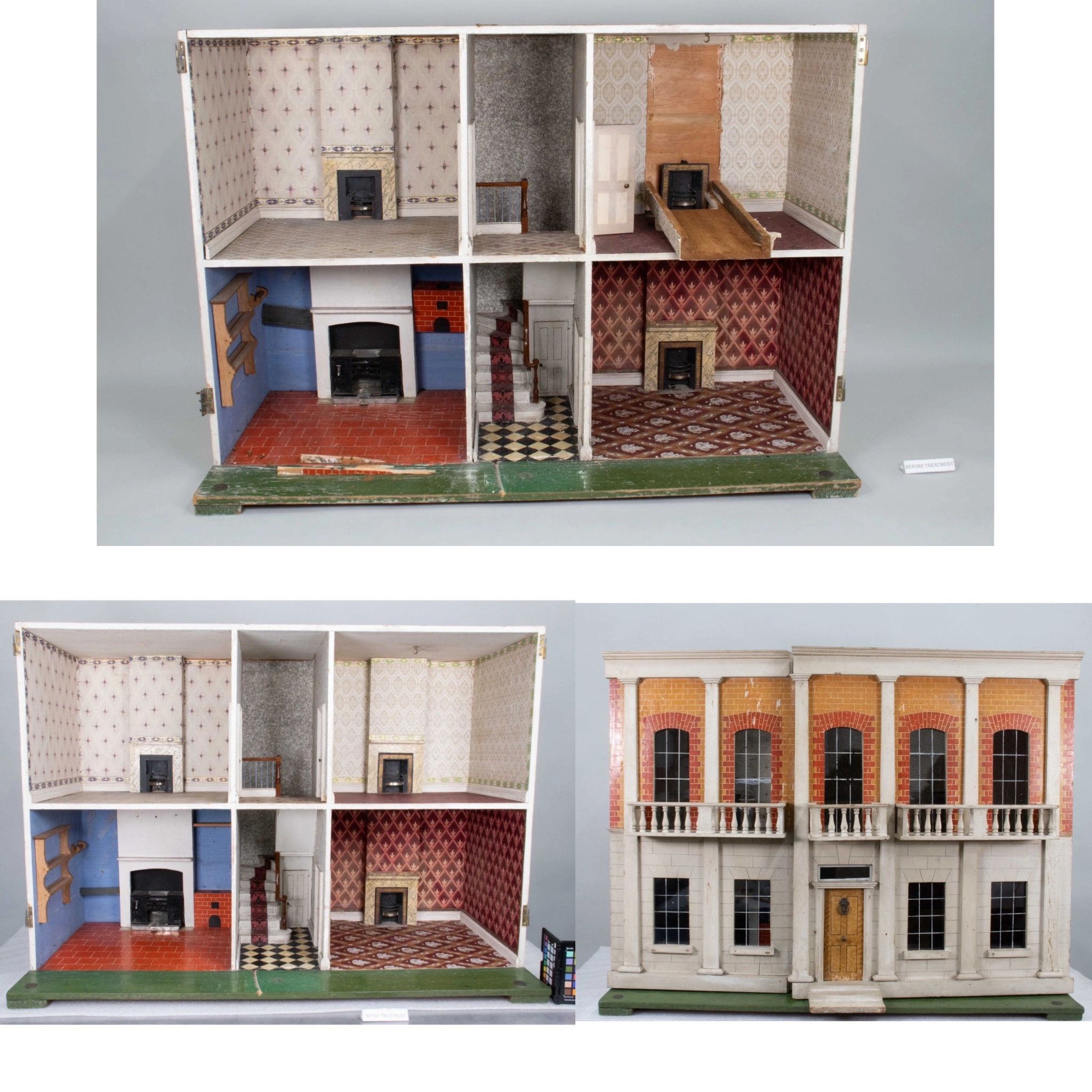 Treatment details: Overall dry cleaning, stabilized wood and paper elements, adhered broken wood fragments, filled losses and recreated wallpaper losses.